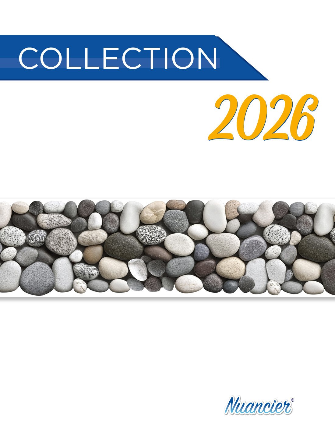 Vendue en bobine de 5 mètres linéaires, elle existe en 14 cm ou 24 cm de hauteur. Ces bandes colorées aux motifs inspirés de galets ne présentent aucune texture ou relief.